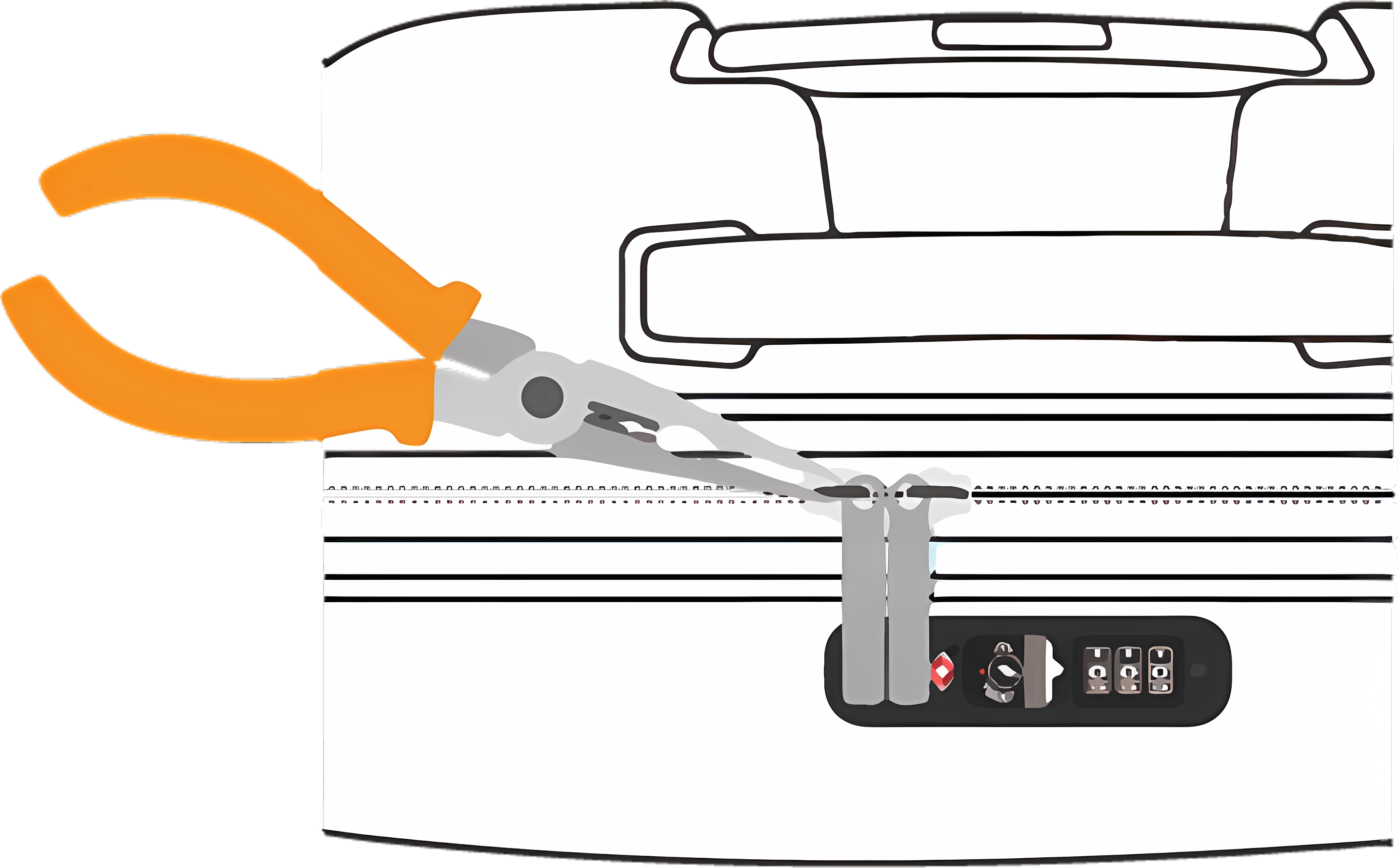 Für die Reparatur eines Koffers mit Schloss-Reißverschluss-Zieher-Kombination müssen Sie zunächst die vorhandenen Reißverschlüsse (die noch am Schloss befestigt sind) wie unten beschrieben entfernen, damit Sie den Koffer öffnen können. Im Anschluss können Sie das Schloss von innen öffnen.